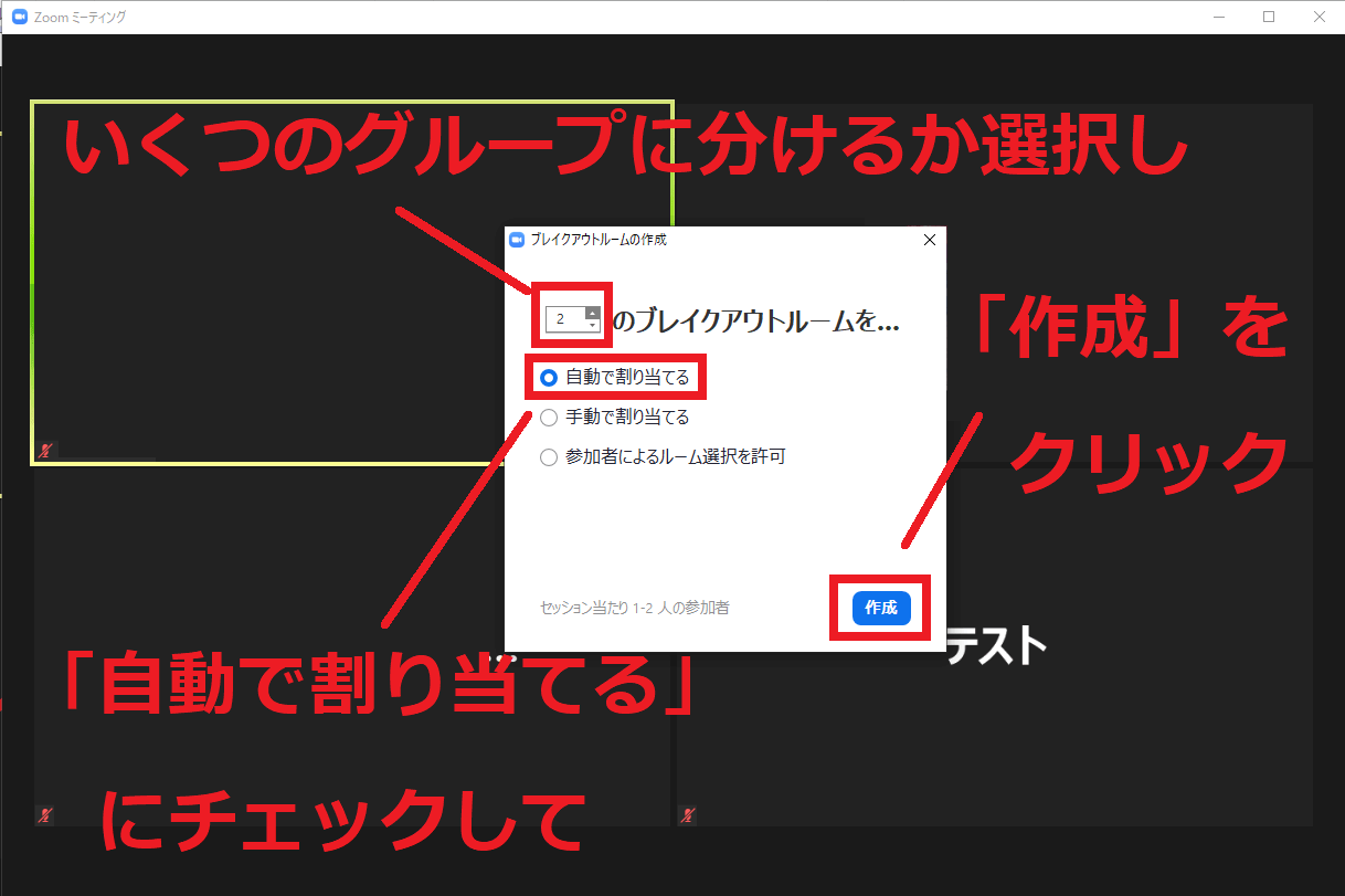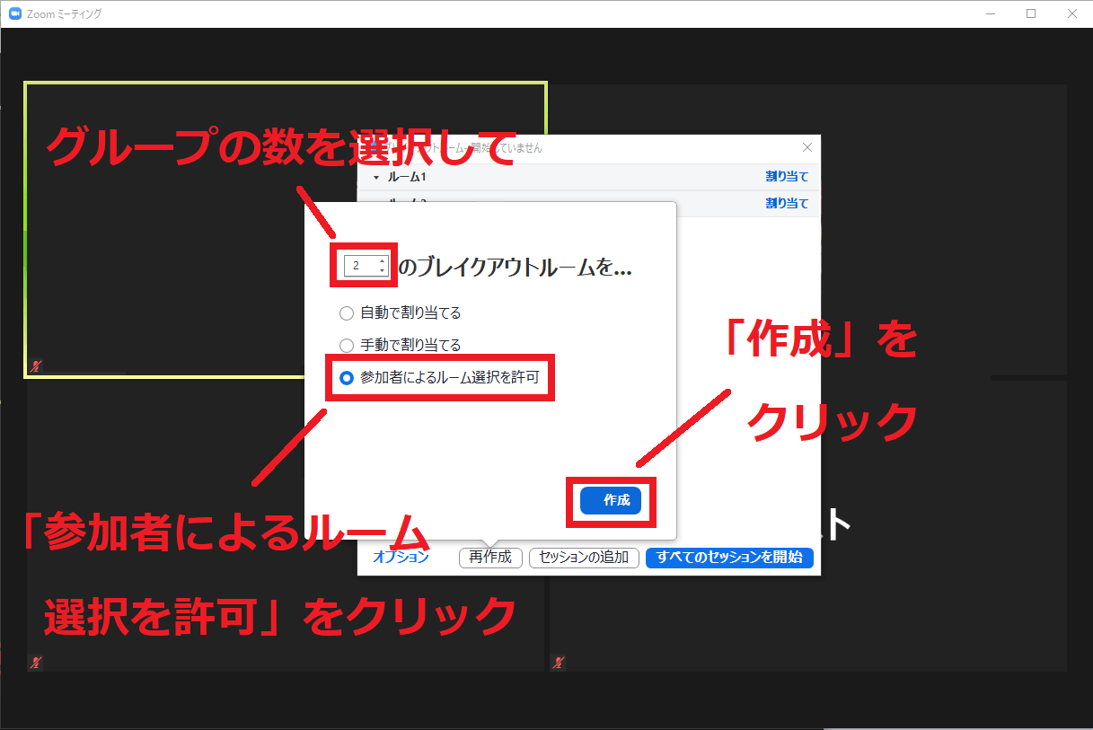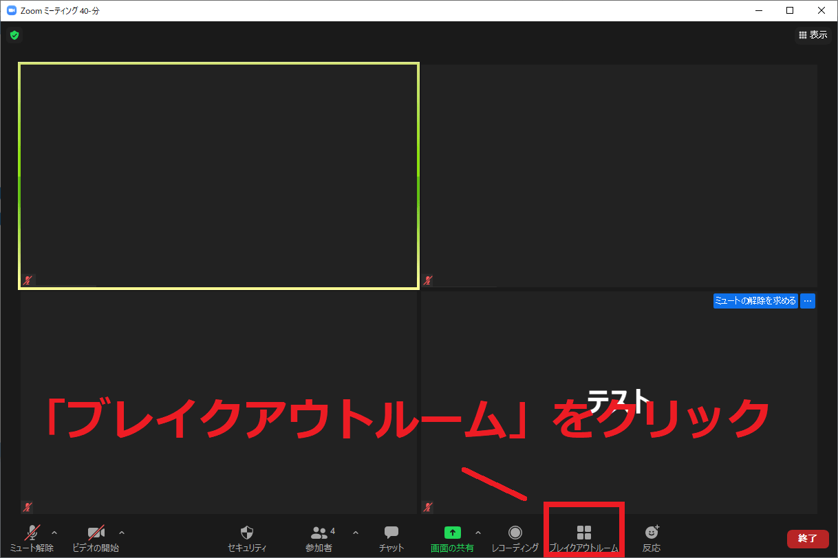ブレイクアウトセッションは画面下の「ブレイクアウトルーム」をクリックして始めます。