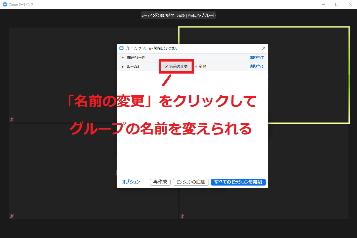 ブレイクアウトするときにホストが振り分けやすいよう、また参加者が任意で移動する場合すぐにどこへ移動すればよいか分かるようにグループ名を変えておくと便利です。